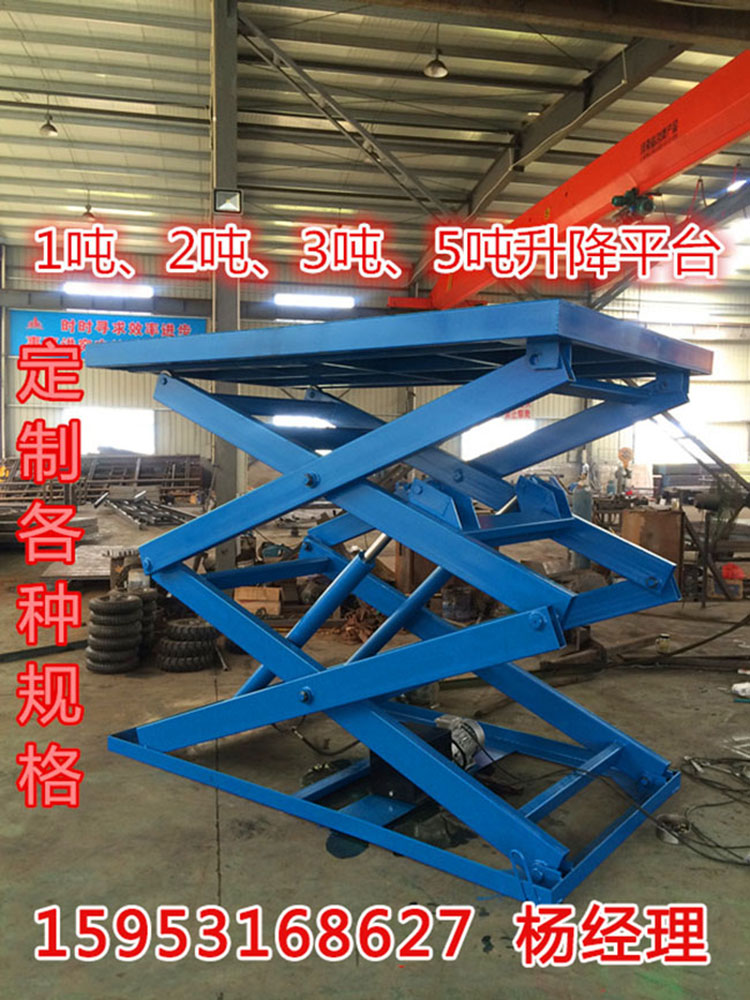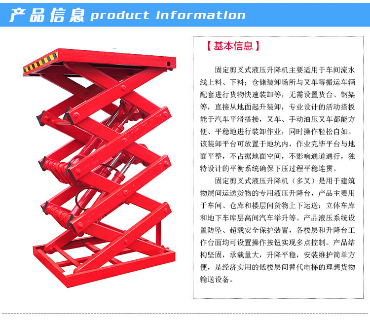 固定剪叉式液压升降货梯是用于建筑物层间运送货物的专用液压升降台,产品主要用于车间、仓库和各种工作搁层货物上下运送:立体车库和地下车库层高间汽车举升等。产品液压系统设置防坠、超载安全保护装置,各楼层和升降台工作台面均可设置操作按钮实现多点控制。产品结构坚固,承载量大,升降平稳,安装维护简单方便,是经济实用的低楼层间替代电梯的理想货物输送设备。液压货梯克服了普通电梯式货梯称重力有限的不足,可称重几十吨的货物。维护简单方便,安装较普通货梯也方便。