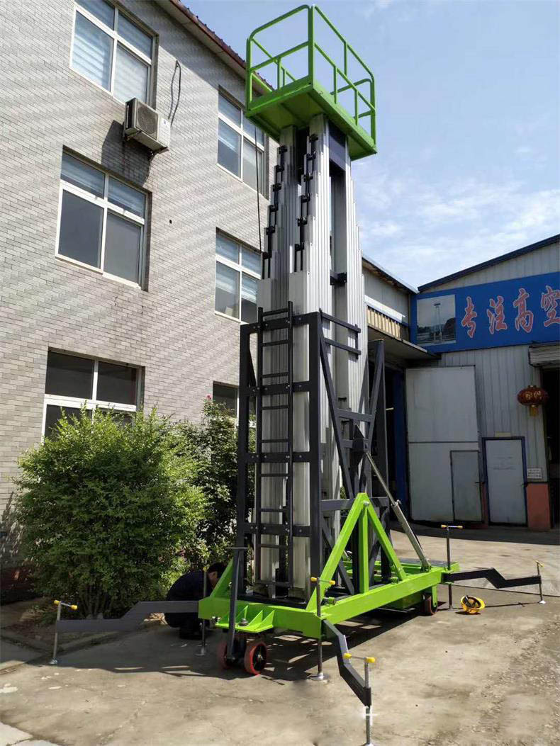 六桅式铝合金升降机整体采用高强度铝型材精制而成由于型材强度高,采用多桅柱式结构,稳定性好,运转灵活,载重量大,平台面积大,推行方便。它轻盈的外观,能在很小的空间内发挥一定的举升能力。使升降台的偏转与摆动极小。该升降机广泛用于厂房、宾馆、大厦、商场、车站、机场、体育场等。可用作电力线路、照明电器、等安装维护,高空清洁等单人工作的高空作业。